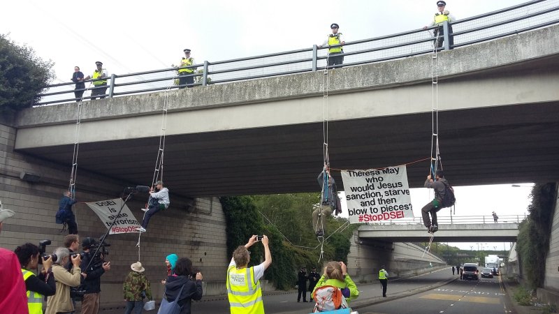 DSEI 2017 Tuesday 2 Published 13 September, 2017 at 2048 × 1152 in Not doing what we’re told: The arms fair, the Daily Mail and civil disobedience Next → Nonviolent protesters block arms fair traffic by climbing down from the bridge near DSEI Trackbacks are closed, but you can post a comment.