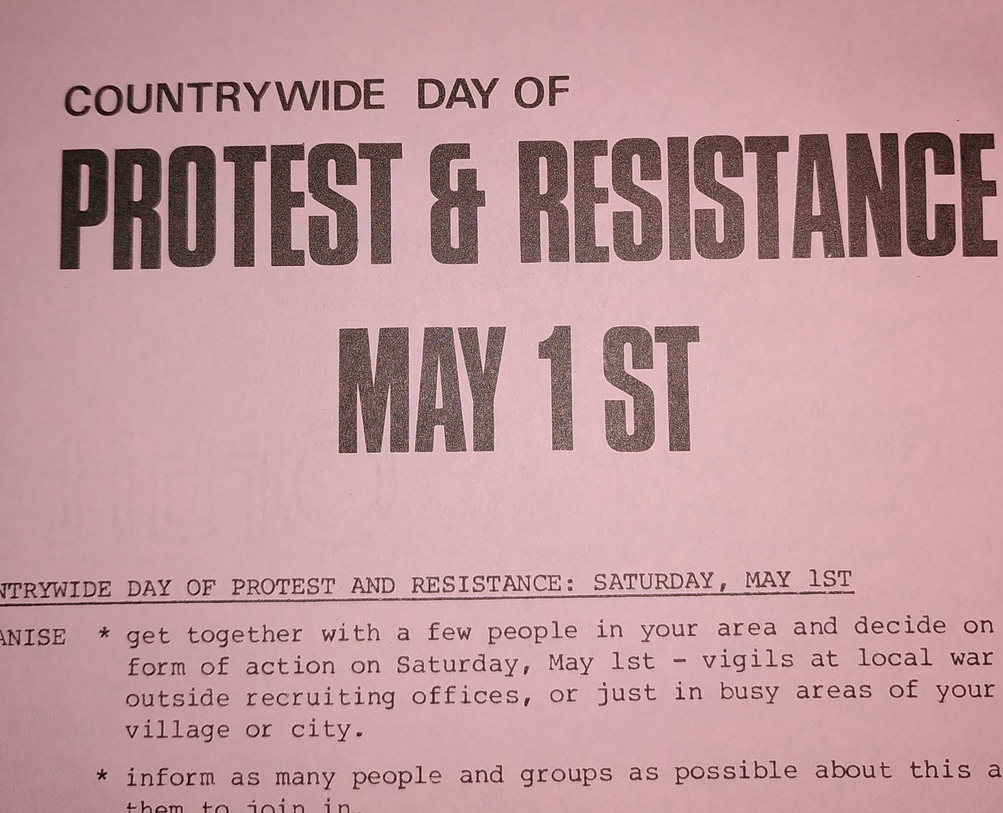 On May 1, 1982, the Peace Pledge Union (PPU) called a Countrywide Day of Protest and Resistance. Demonstrations and vigils took place in at least 30 towns and cities. Some involved small-scale marches, others were more dramatic. Women in Sheffield occupied a Royal Navy recruitment office. Another recruitment office was paint-bombed in Holborn. Protesters in Glasgow were arrested while handing out leaflets and selling newspapers.