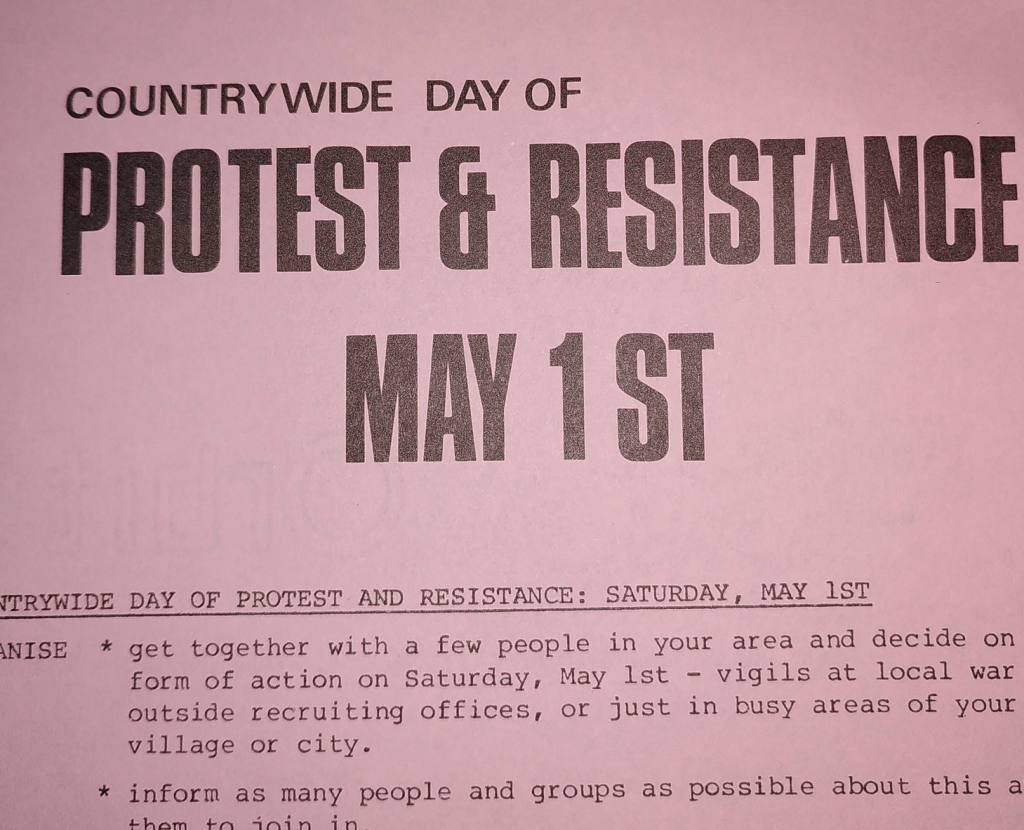 On the day of resistance on 1st May, Nottingham pacifists were surprised by how many passers-by agreed with them when they handed out leaflets with the local CND group. In the naval city of Plymouth, activists found far less support. Robert Harris, a peace activist in Bangor, found a more sympathetic response from Welsh-language media than their English-language counterparts.